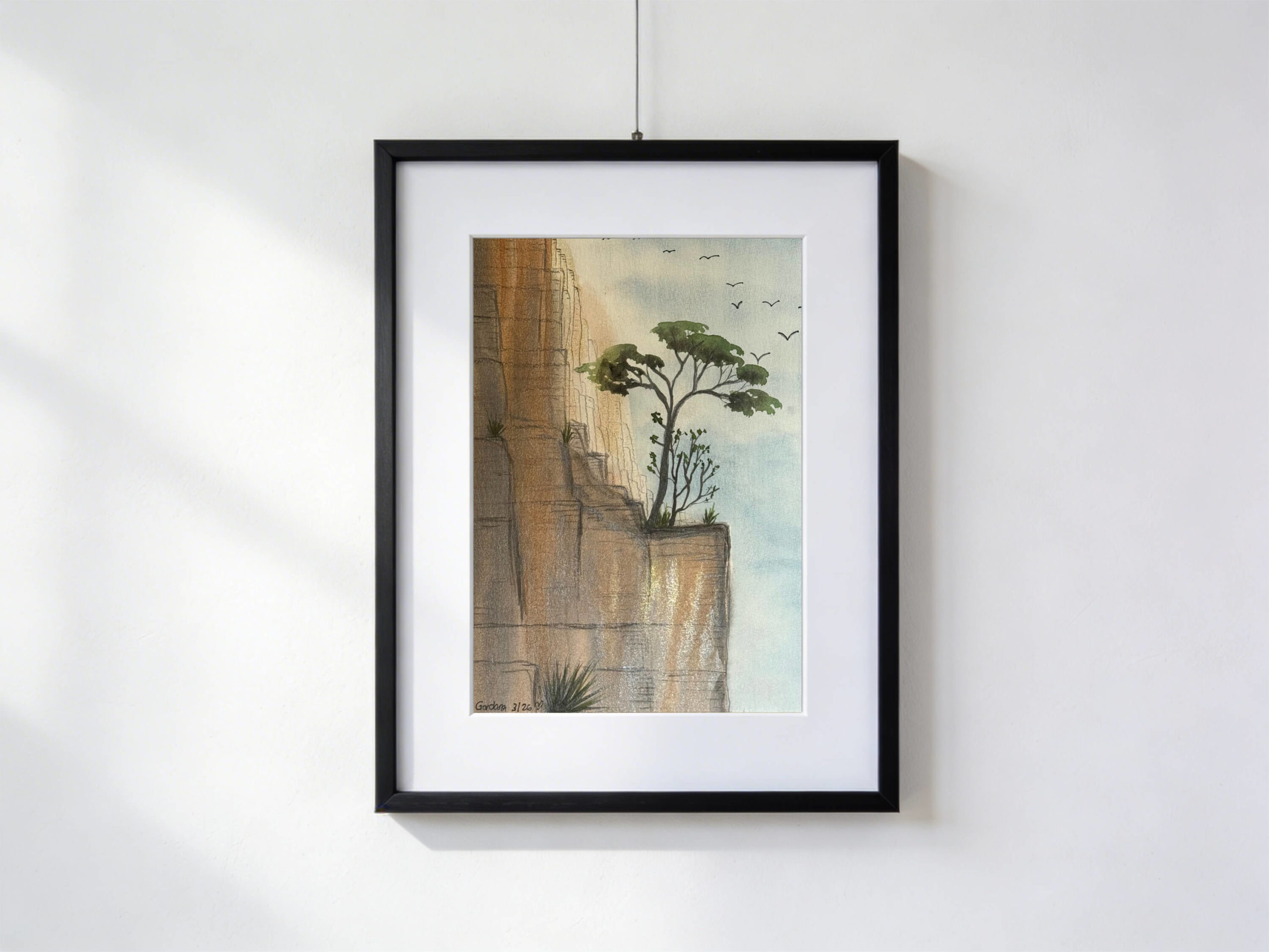 In una valle desertica, la parete rocciosa sembrerebbe inospitale, eppure da una fenditura nasce una piccola oasi: cespugli e arbusti si raccolgono attorno a un albero che cresce in equilibrio sul vuoto. I toni caldi della roccia dialogano con i verdi più morbidi dell’oasi, mentre le linee di china e matita definiscono le spaccature della pietra e la trama della chioma. Alcuni uccelli si avvicinano dall’alto, attratti da questo punto di vita inatteso sospeso nel silenzio della valle.