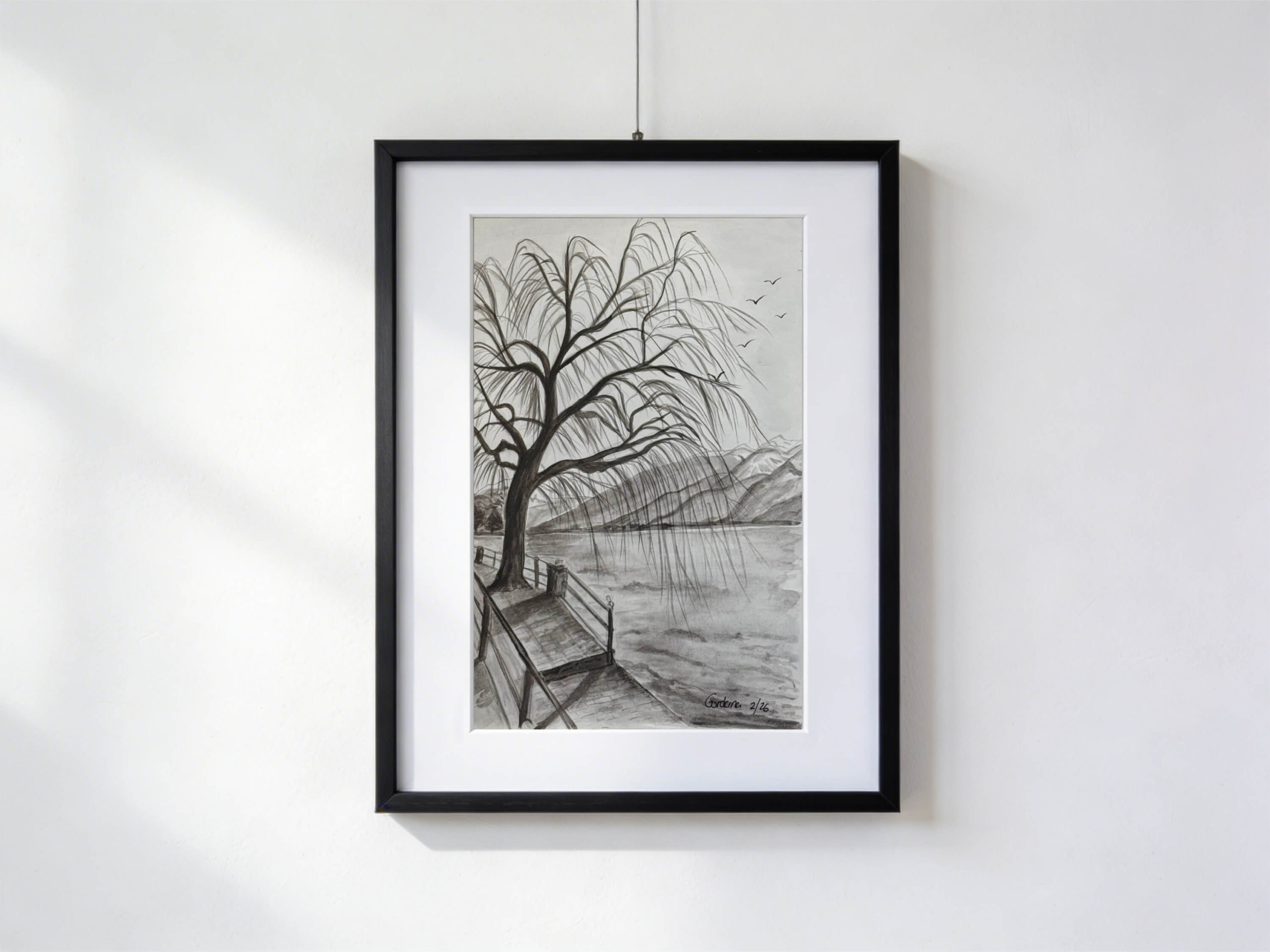 Salice Piangente sul lungolago di Muralto, acquarello in bianco e nero, china e matita su carta semi ruvida 300gr