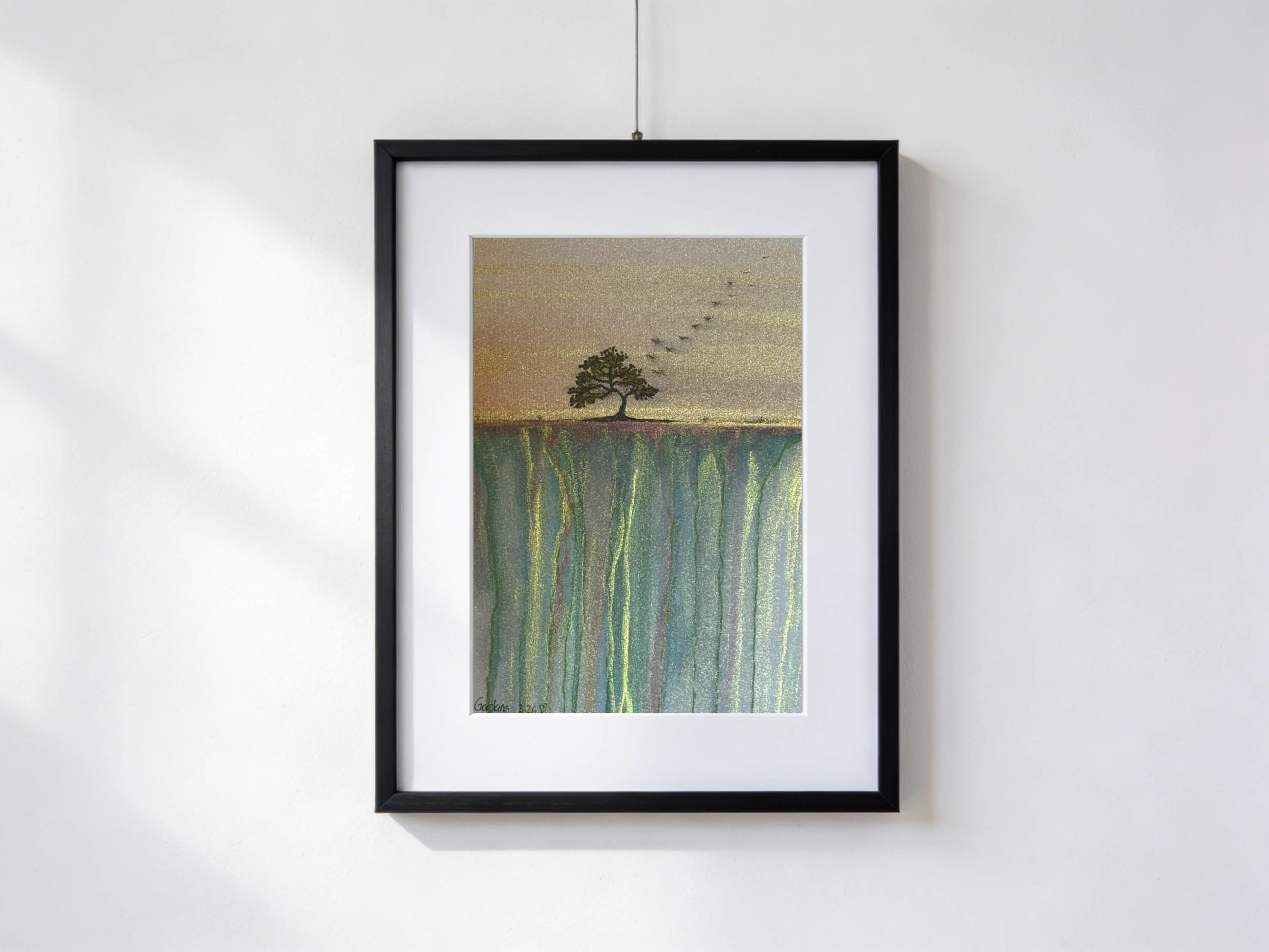 Sogno dell’albero solitario è un acquarello originale di Gordana Majic che nasce da un paesaggio interiore, sospeso tra realtà e fantasia. Un albero nero si staglia su un bordo dorato, come se vegliasse sull’orlo del mondo, mentre le oche in volo, sfocate dalla foschia, migrano verso un orizzonte lontano. Le cascate turchesi si riversano in un abisso luminoso di riflessi dorati, creando un contrasto continuo tra profondità e luce. I tocchi d’acquarello, i riflessi dorati, la china e la matita lavorano insieme per dare ritmo al movimento dell’acqua e del cielo, suggerendo il passaggio del tempo e dei pensieri.